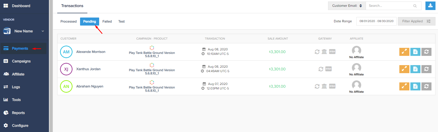 Important: Keep in mind when someone uses an eCheck to pay for your product, it usually takes 3 to 5 days to clear/process.   Which means the product will not be delivered until the the vendor has received the funds.   Those transactions can be found under “Transactions” >> “Pending”.  We check every night to pull the latest status from Paypal if the transaction has been completed, still pending or denied.