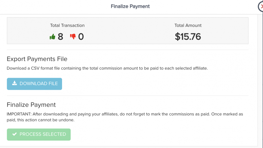 *NOTE: If sending commissions to PayPal, they offer a Mass Pay option vendors can use to upload the CSV to Paypal to finish sending the commission payments: https://help.paykickstart.com/knowledge-base/sending-affiliate-commission-payments-via-paypal-mass-pay-file/