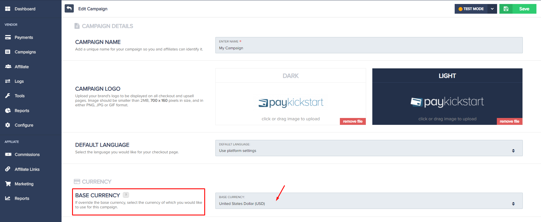 Step 3: Choose the Base Currency you would like to use and Save the Campaign’s settings.