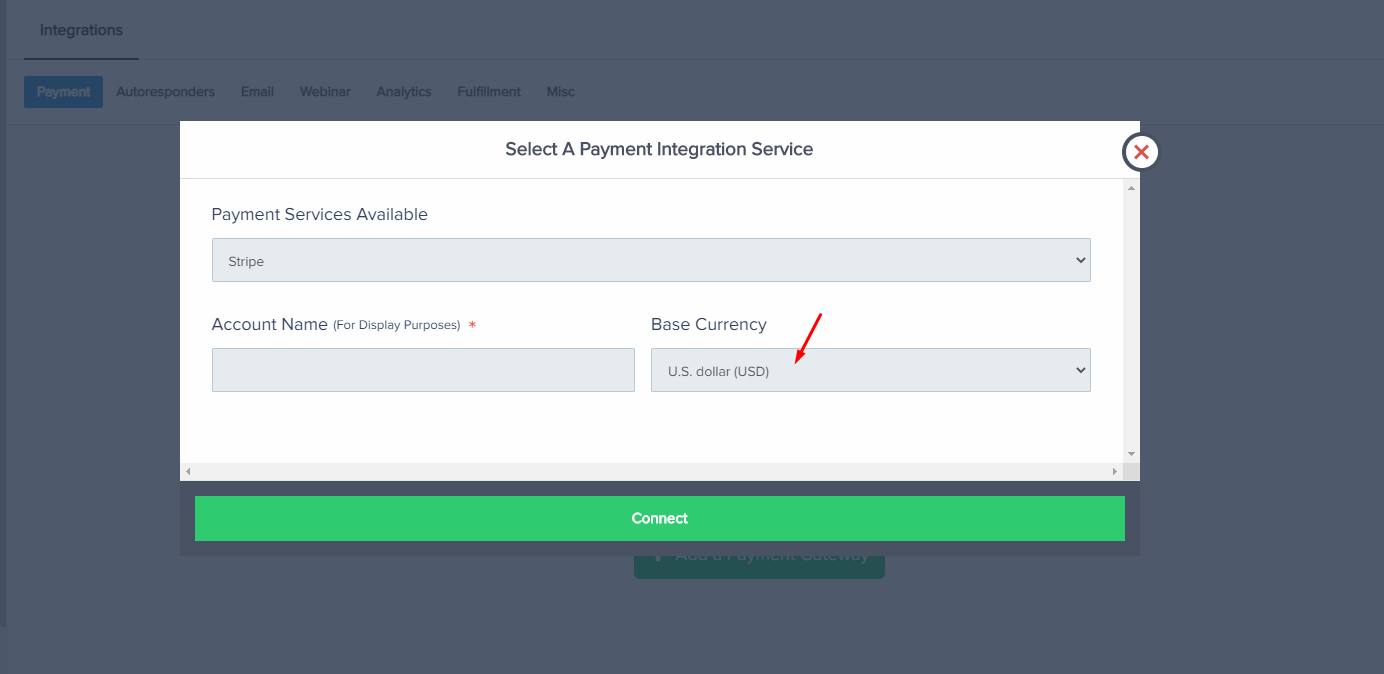 Step 1: Go to Configure and choose the Integrations page and click on the Payments tab. Choose the Payment Gateway you want to integrate with and then select the Base Currency. This will be your default currency used for each product you sell.