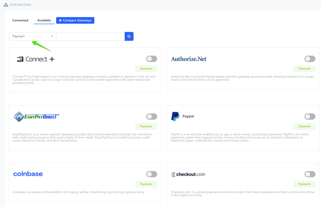 In the Configure ⚙️ Menu select Integrations and select Payment on the dropdown Menu.