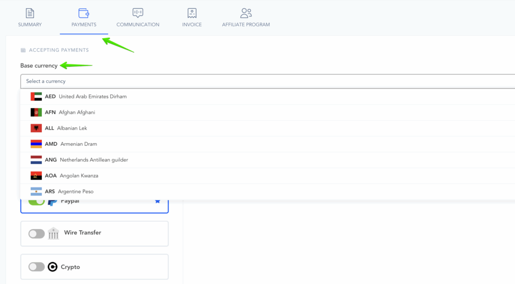 Note: You can process payments in up to 32 different currencies. However, the specific currencies available depend on the payment gateway you choose to connect.