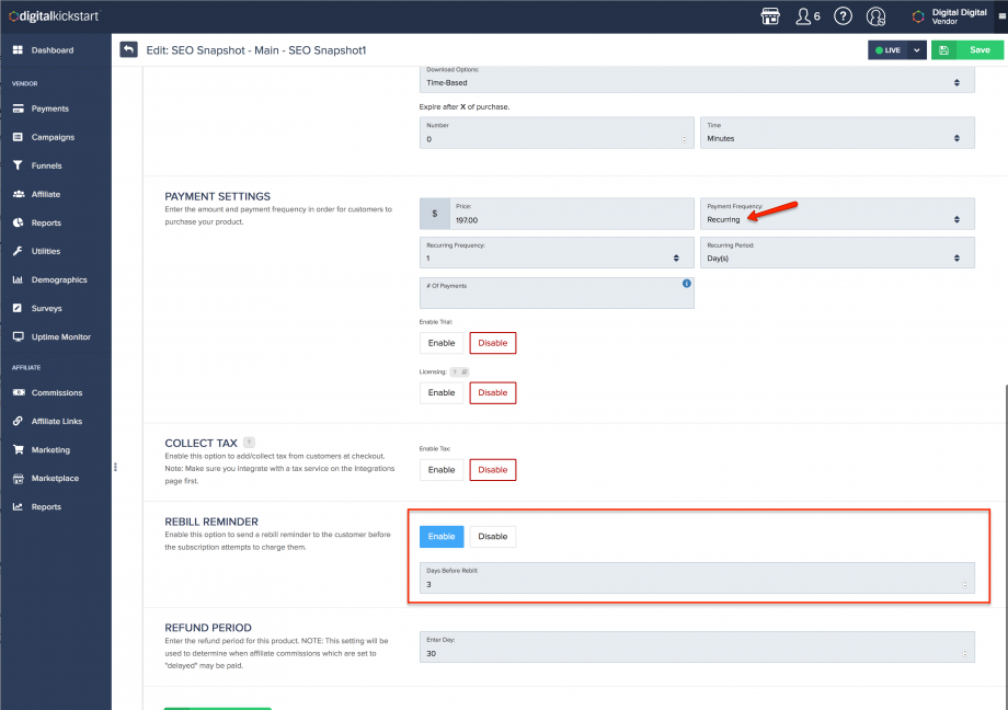Easily specify how many days before the charge takes place, that the email should be sent out. This feature can be found in the Product settings (Campaigns >> Edit Product).