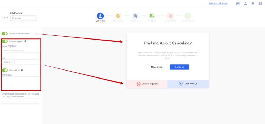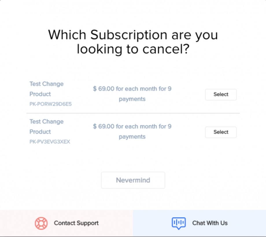 Change Product: Offer to change the customer to another subscription product. You can select the product(s) you want to offer the customer the option to switch to instead of canceling.
