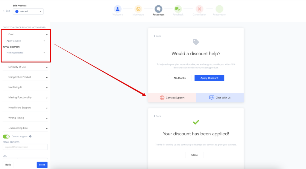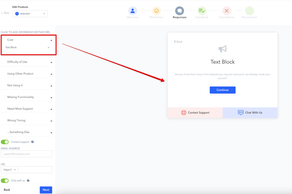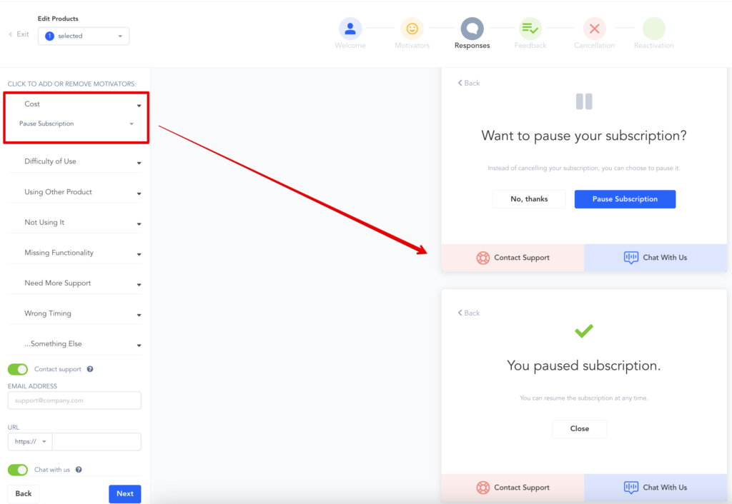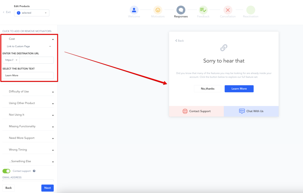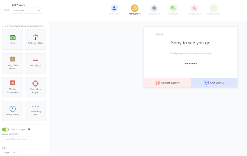 - Add/Remove motivator choices: Add or remove the options you want to offer customers as reasons they are canceling their subscriptions.