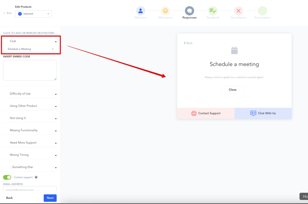 Schedule a Meeting: You can embed a meeting calendar script from companies like Zoom, Calendly or any other meeting service you use to allow canceling customers to schedule a call with your team.