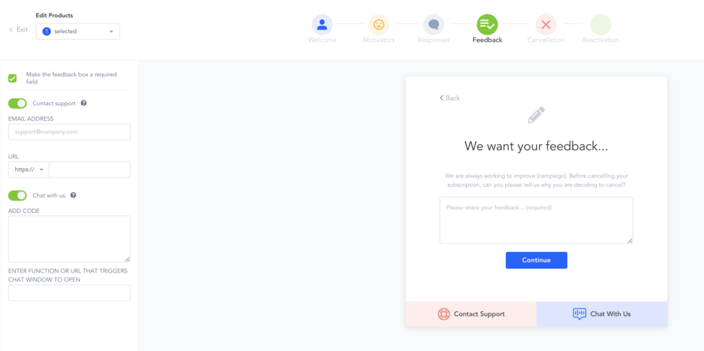Products: Product related to the cancellation widget. Must be a recurring priced product. You can select 1 or multiple products from the campaign.