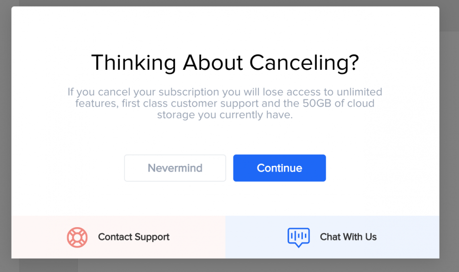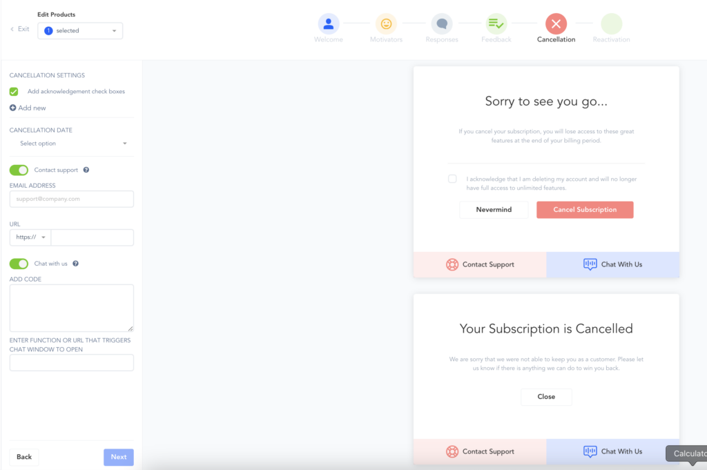 Once you added the cancel script to your button and pass the customer secret ID, customers will be able to use the cancellation save widget to either cancel their subscription, contact support or take a retention offer.