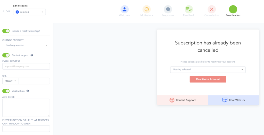 Include Reactivation Step: If disabled, the customer will not be offered a reactivation option after canceling.