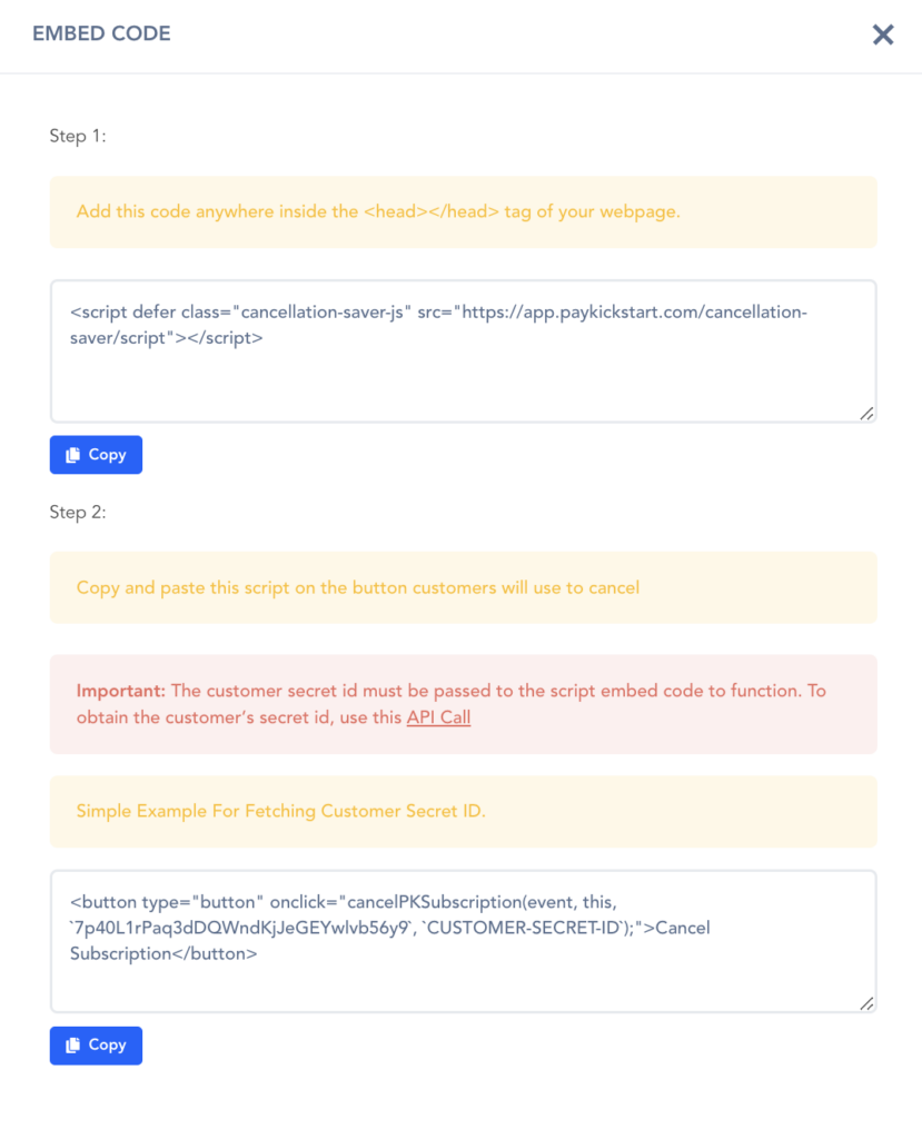 IMPORTANT: In order to allow the cancellation saver to function, you will need to replace the “Customer-Secret-Id” variable in the embed code script with the specific customer’s secret ID.
