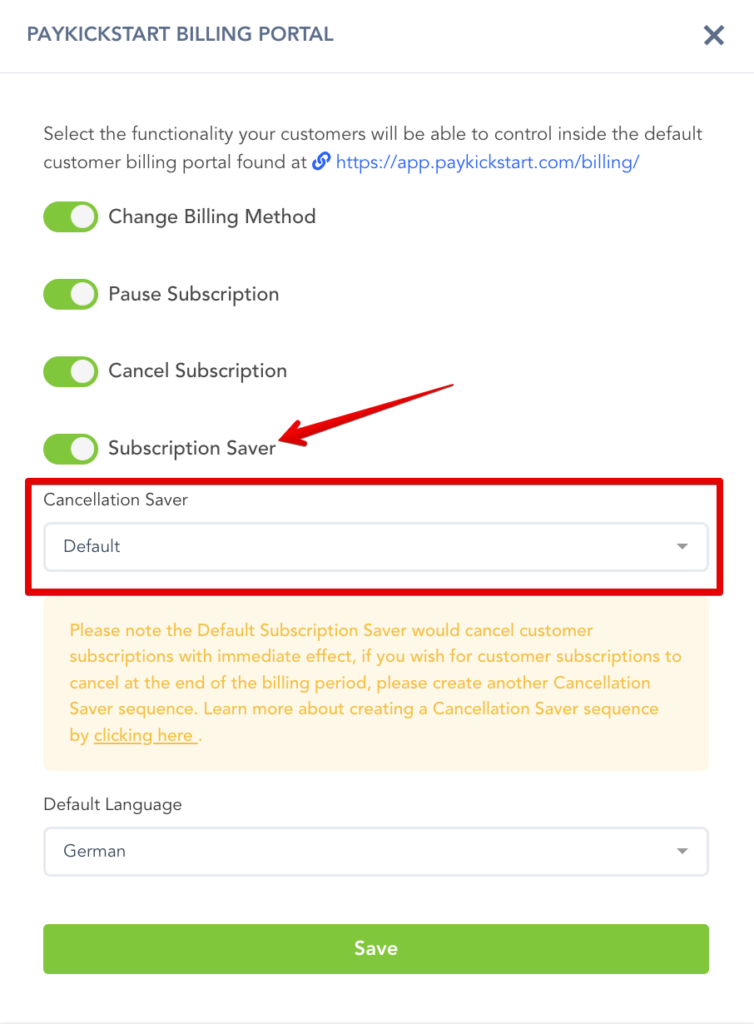 If you are looking into adding the Cancellation Saver sequence to your Customer Billing Portal you can enable the Subscription Saver option in your Default and/or Embeddable Billing Portal settings.