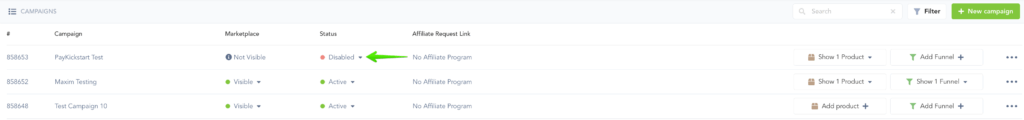 The Campaign or Product status settings allow you to easily manage and update your Campaigns or Products.