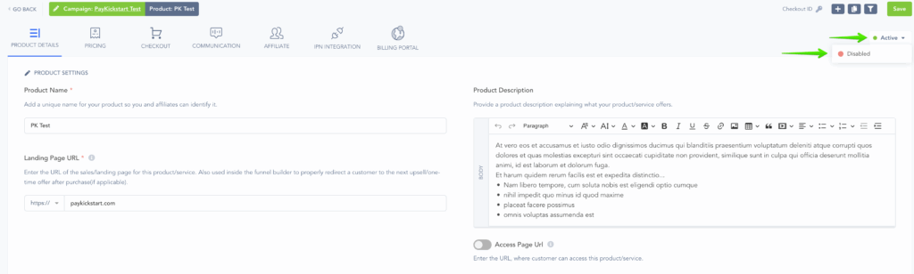 From a Campaign level, you can set your campaign to Active, which means all products and funnels will be available for sale.