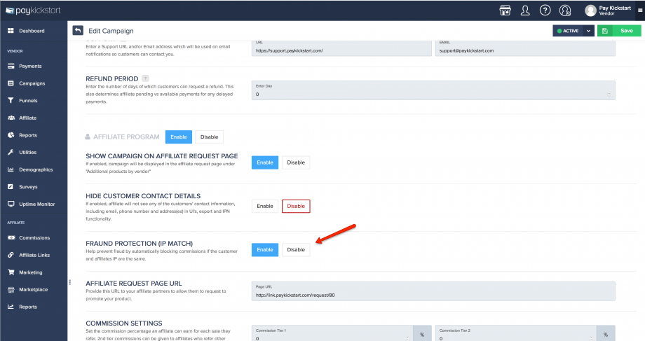 However there may be use-cases where the vendor may want to disable this feature. To do that, simply go to your Campaign settings and under the “Affiliate Program” section, click Disable.