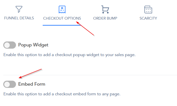 Step 4: Now,click on “Checkout Options” and enable “Embed form”.