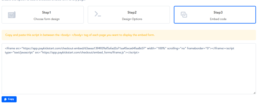 Step 7: Finally, copy that Embed Code and place it at your own domain’s checkout page.(Embed form step 3)