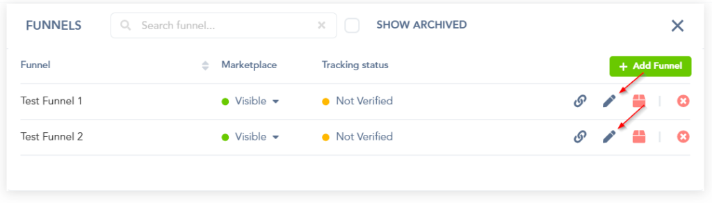 Step 2: Click on the Blue “Edit” icon of the funnel you want to use the embed form with.