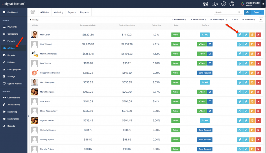 Vendors can lookup a specific affiliate’s unique tracking link for any of the Campaigns owned by that vendor.