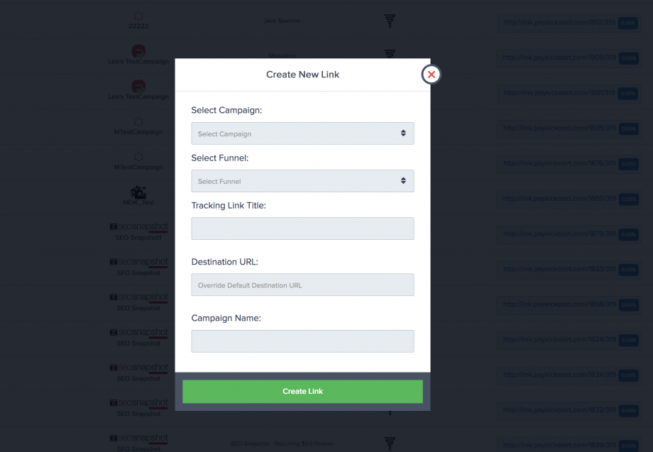 If you want to create a New Link for an affiliate, after clicking the New Link button you will see a pop-up modal. Select the Campaign & Funnel the link should be associated with, then give a unique name for identification purposes and what URL that tracking link should redirect to.