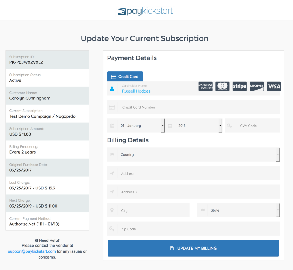 If you choose to send out an email reminder to Update Billing Details, the customer will be sent an email with a link to update. They will click on the link and will be taken to a page that looks like this to update their subscription.
