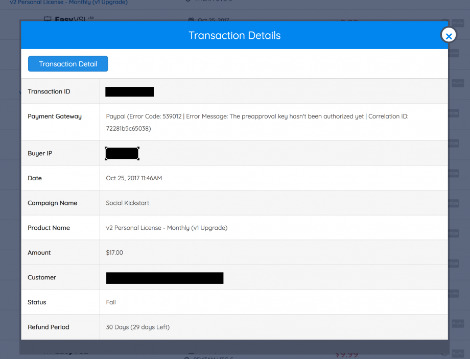 Also, we provide you with details on WHY each transaction failed. The reason provided comes directly from your Payment Gateway, and we show this to you in the Transaction Details. It will look something like this.