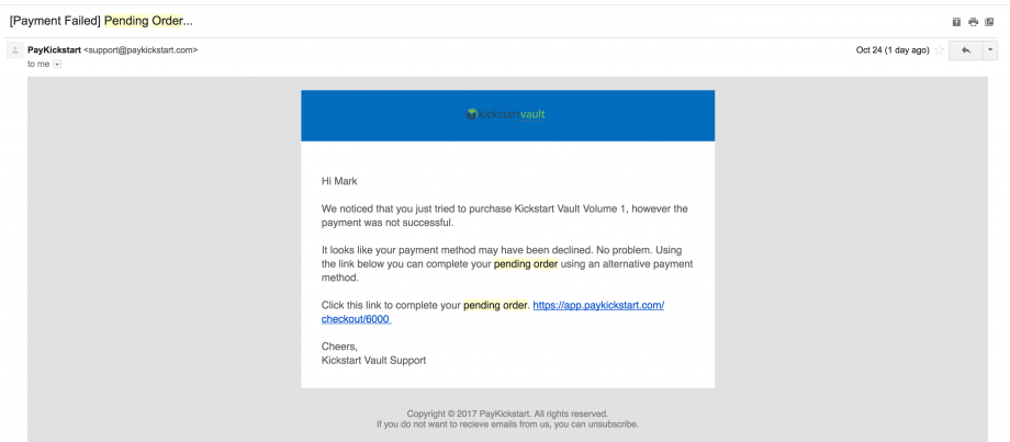 Whenever a transaction fails, PayKickstart will do its best to try to Save the Sale. Which means that 5-10 minutes AFTER the transaction fails (and that same customer does not have a successful purchase), we will send out a “Payment Failed: Pending Order” reminder email to ask them to try again.