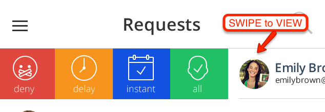 From here, you are taken to an Affiliate Requests screen to view the options of each affiliate request, slide to the right. The options will appear. Then tap on your choice.