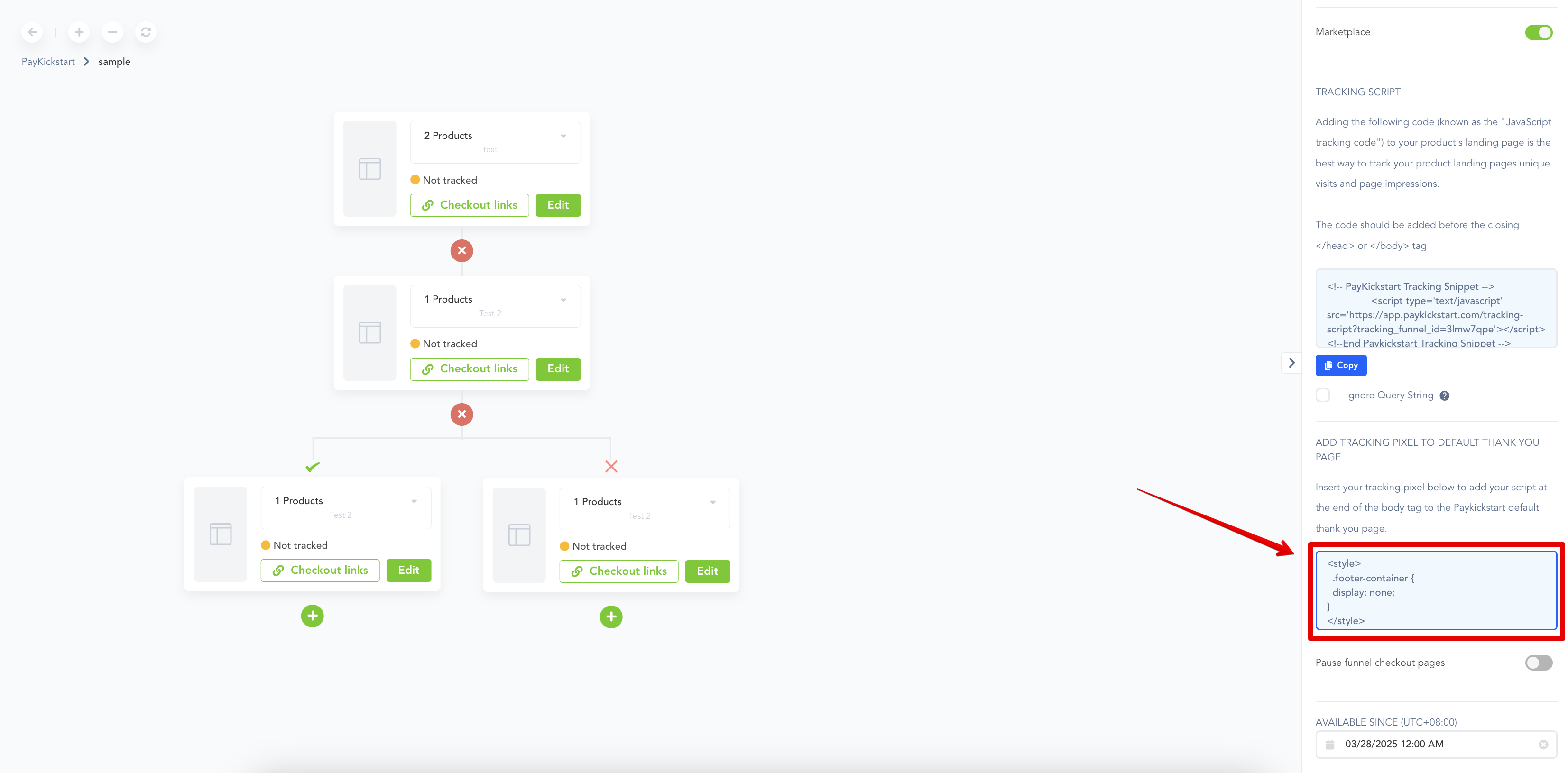 Add the following CSS code to the “Tracking Pixel “section of the funnel.