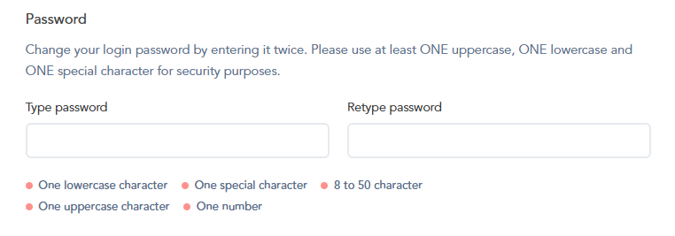 In your Profile section, you can type in your New Password twice to change your current account’s password:
