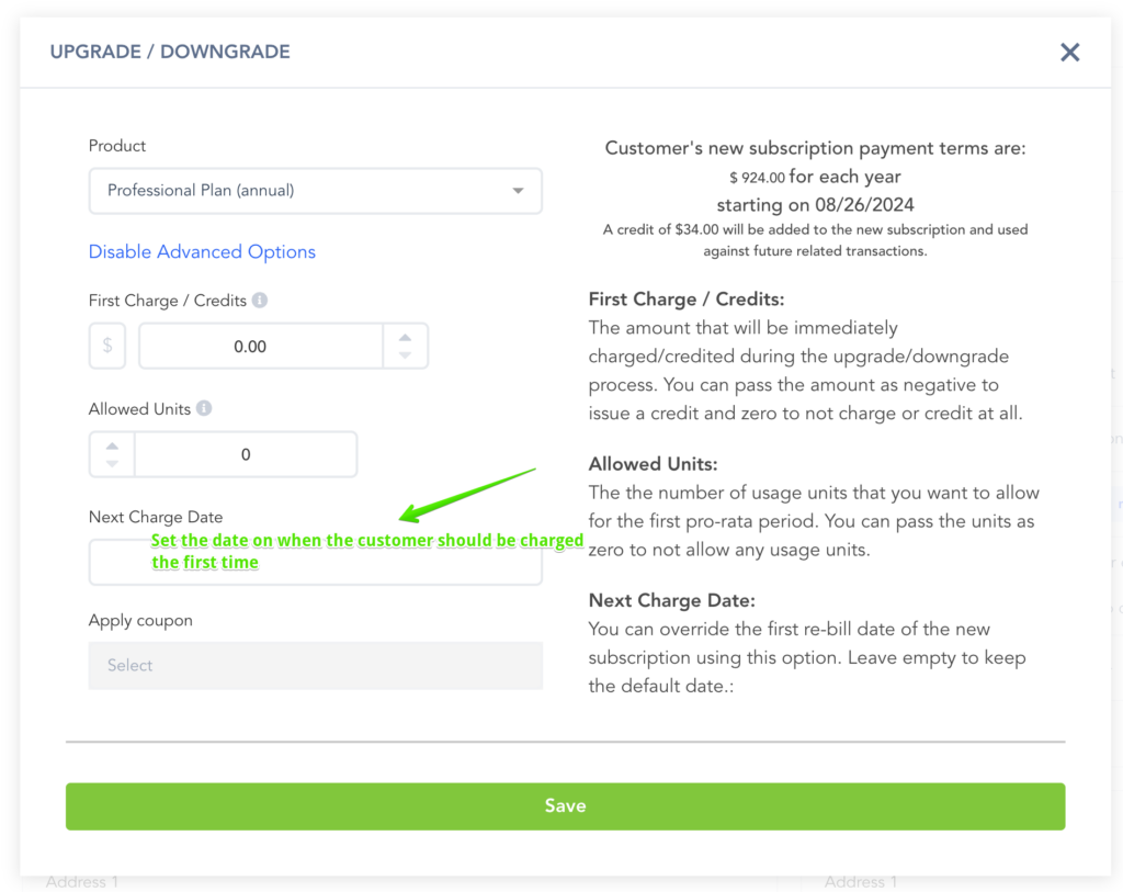 - If the remaining trial days are higher than 0, then in the upgrade/downgrade user interface (or in the API call) set the First Charge amount to 0 and the Next Charge Date to the date value that would include the remaining trial days
