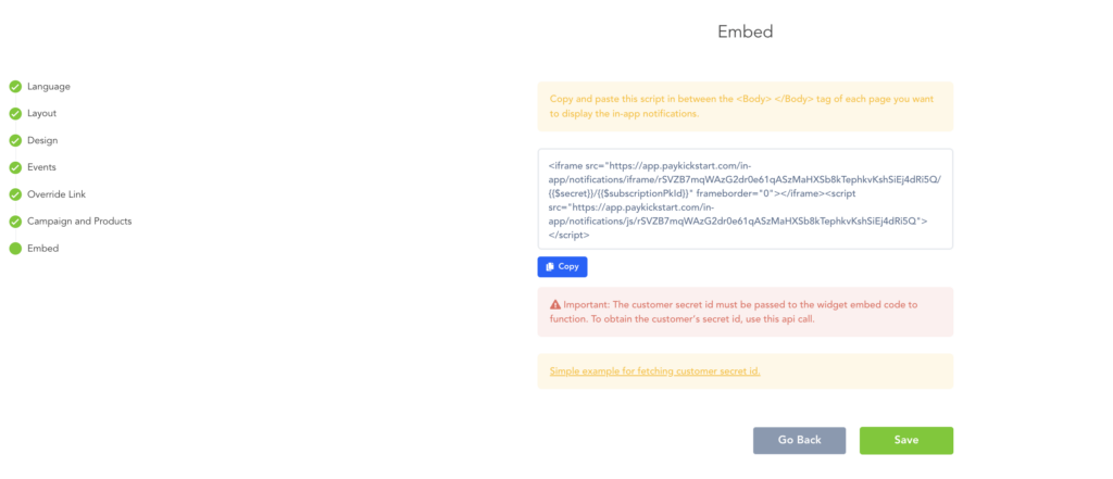 IMPORTANT: In order to allow the In-app notification widget to function, you will need to replace the “$secret” variable in the embed code script with the specific customer’s secret ID and also $subscriptionPkId with the customers pk_id.