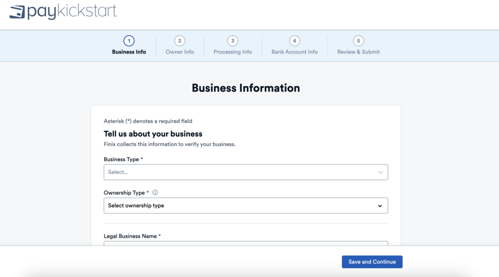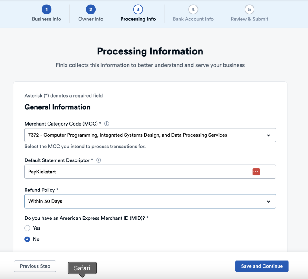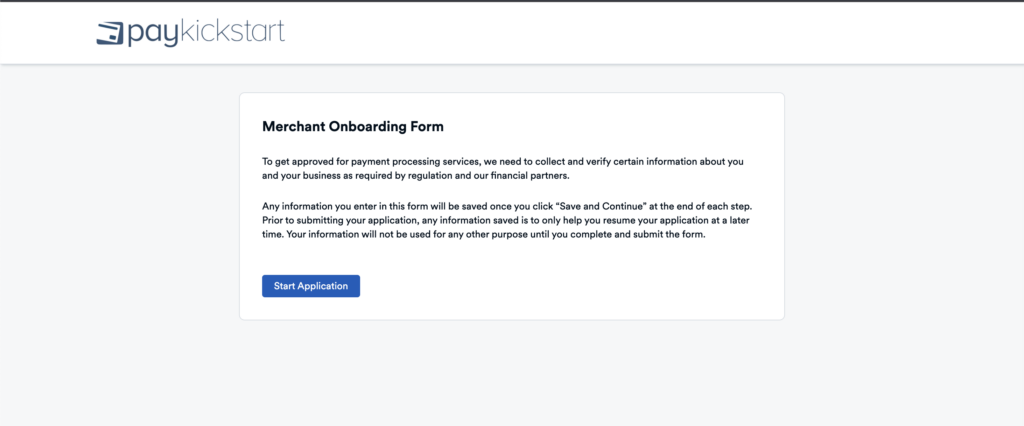 You will then be directed to the “Merchant Onboarding Form” page. Click on the “Start Application” button to continue.