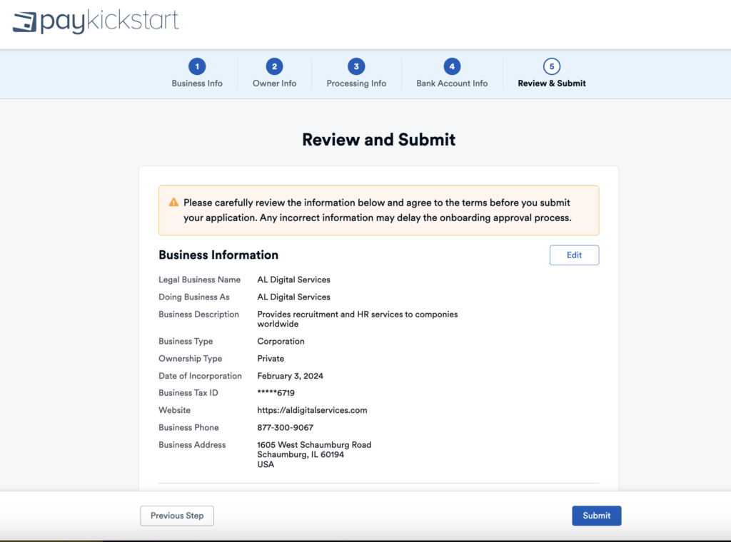Please review provided application information and when ready click to submit your CONNECT by PayKickstart gateway application.