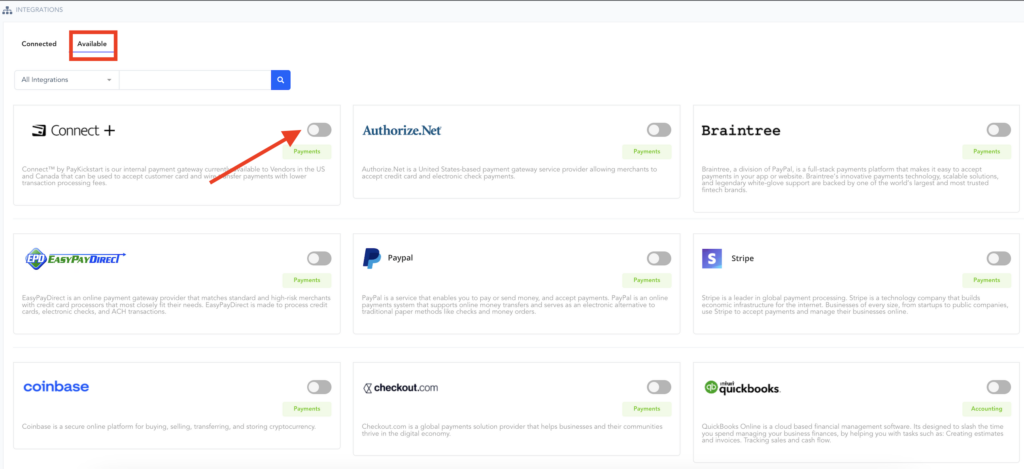 In your PayKickstart vendor account, go to Configure > Integrations section: https://app.paykickstart.com/admin/integrations