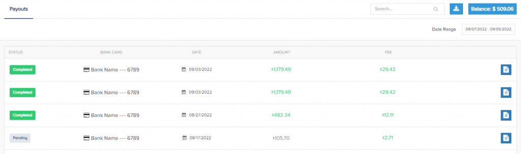 Payments > Payouts: will show the related customer payment funds that are pending or ready to be transferred to your bank account. This tab will also list a history of past payouts to you.
