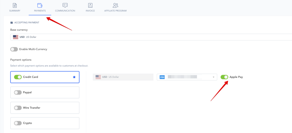 Then make sure Stripe is selected, and you can also enable the Apple Pay option.