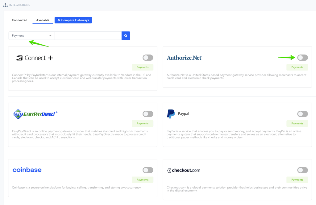 Login to your PayKickstart account. Go to Configure and select “Integrations” >> “Payments“.