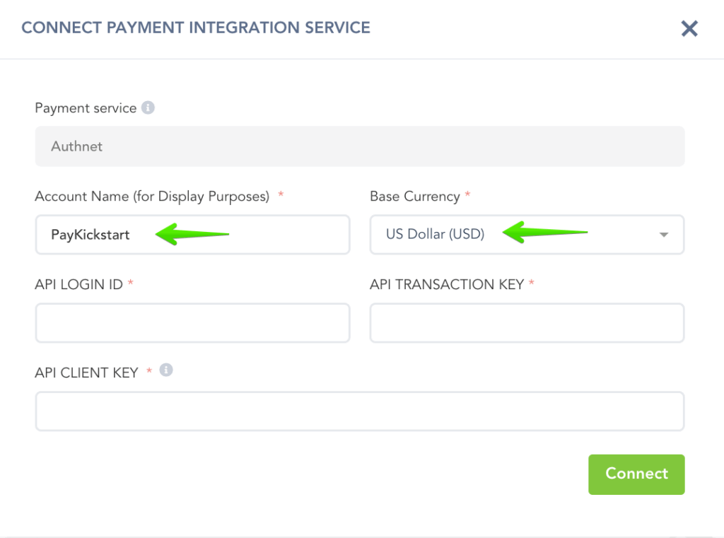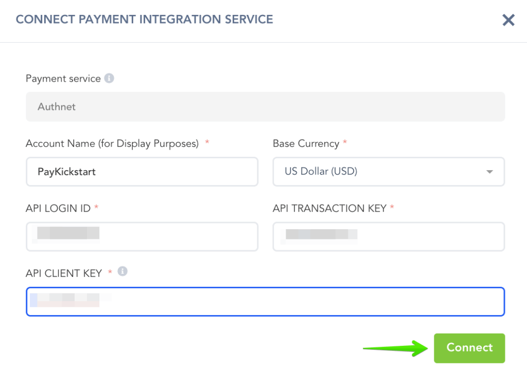 After you have obtained all the necessary information, return to the main integration page in PayKickstart and click on Connect.
