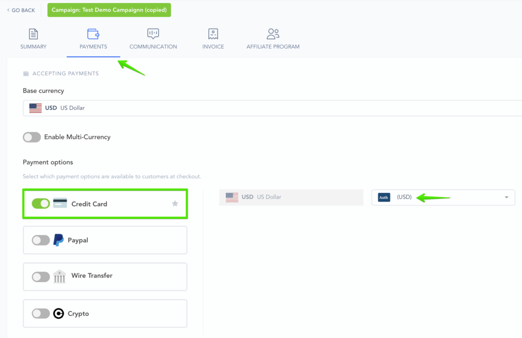 - Enable the credit card option on the campaign settings and select Authorize.net connection. The selected icon will turn blue and show a green checkmark.