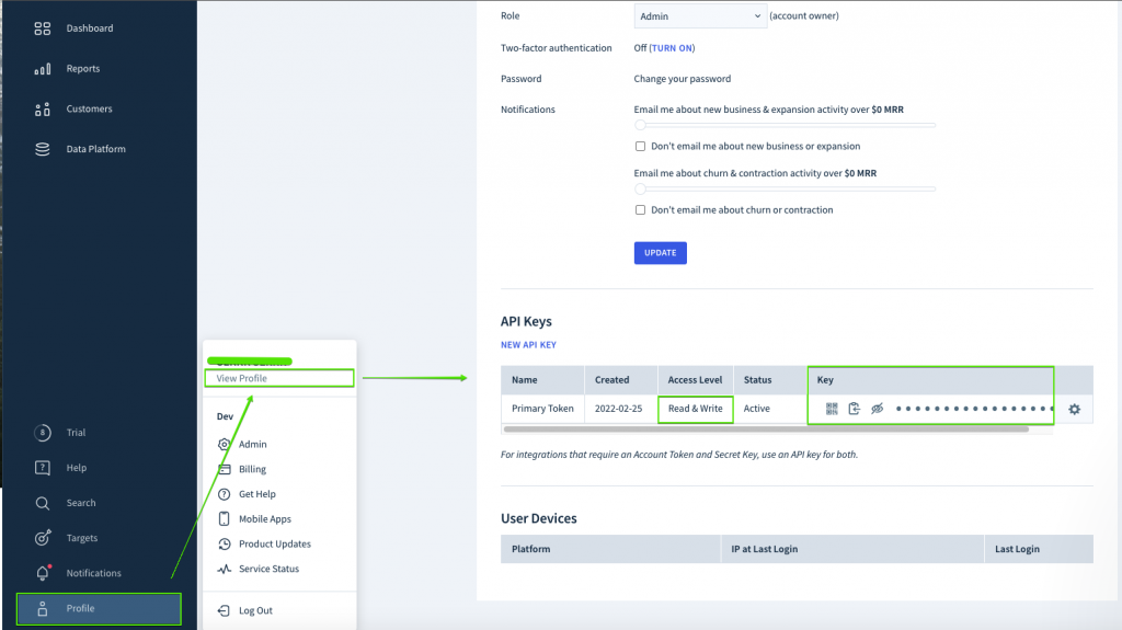 To locate your ChartMogul API Key, click on the Profile option and choose to view your Profile, as seen in the image below: