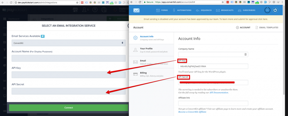 Step 5: Enter your ConvertKit account name and API key and API Secret click ‘Connect’.