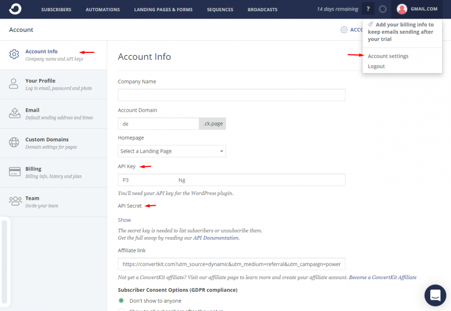 To obtain your API Key and API Secret code click on Account Settings under your name in ConvertKit and go to your Account Info tab.