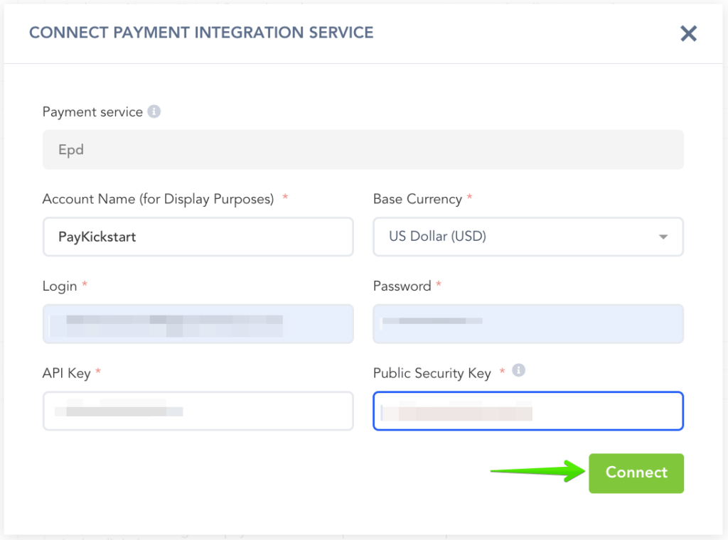 3. Return to the Easy Pay Direct integration on PayKickstart and enter the KEY, then click Connect.