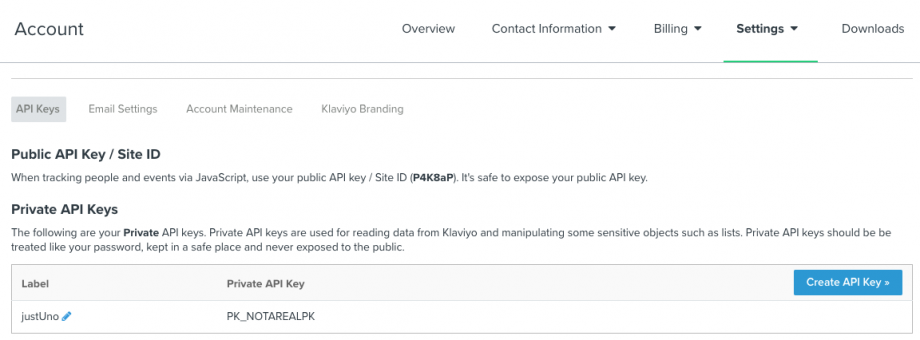 You can find your Klaviyo Key as seen in the example below.