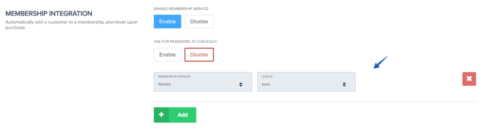 Select the Membership integration service and select the Level the product is related to, then confirm your choices by clicking on Add again.