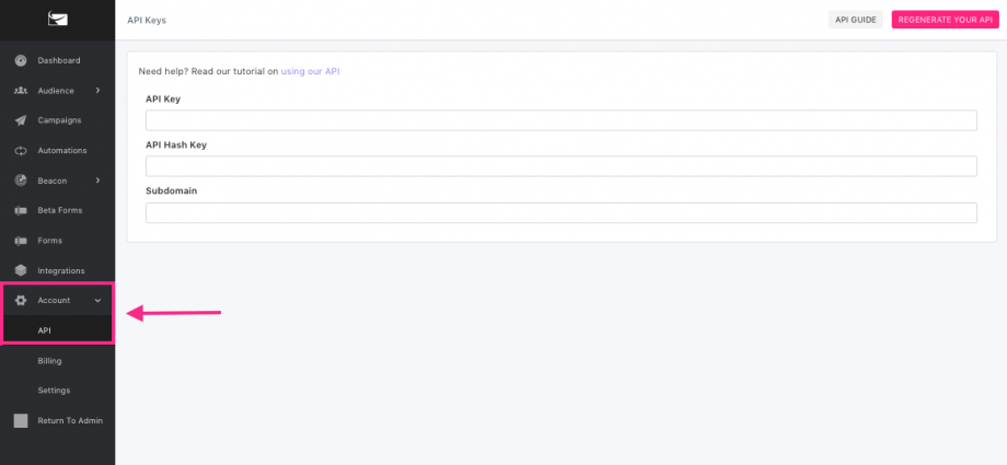 - How to find API Information: To access your API Key you need to logon to your Sendlane account and click your account settings. Within your Account settings you will see a section titled “API”. There you will see the API & Hash keys.NOTE: You must add HTTPS:// to the API URL in the PayKickstart/Sendlane integration