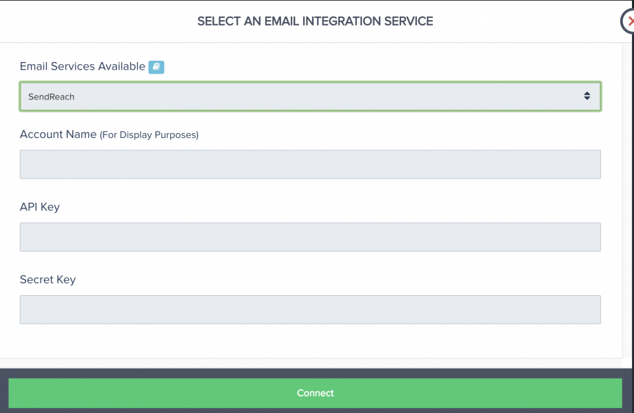 Step 5: Enter your SendReach account name, API Key, and Secret Key and click ‘Connect’.
