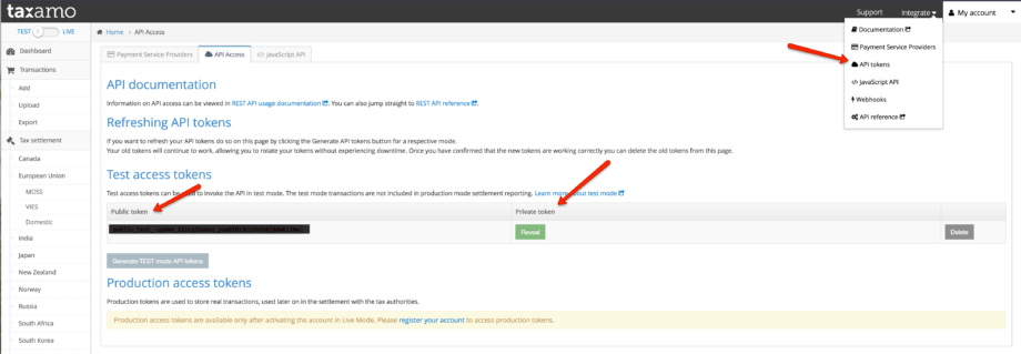 Step 2: Login to your Taxamo account, click on “Integrate” >> “API Tokens”. Copy your Public and Private tokens they provide.