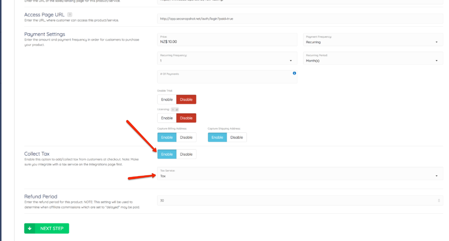 Step 4: Adding tax collection will be done on the product level. So you will want to go inside your Campaign, then edit the product. You will see an option called “Collect Tax” just toggle that to Enable and select the Tax Integration account you previously integrated.