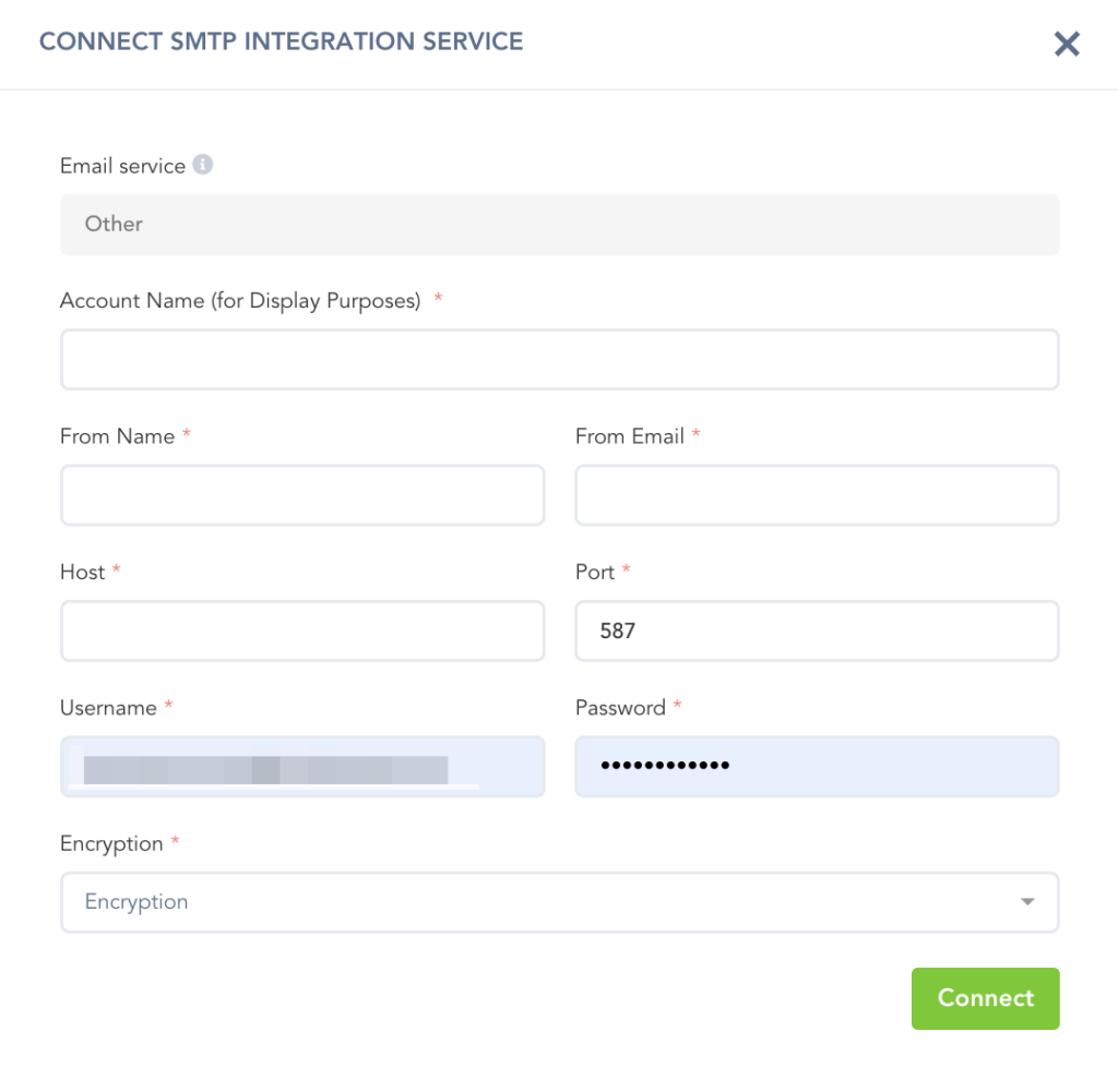 - Username: Your account username(or email) for the email service you are integrating with.